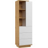 Wysoki nowoczesny regał o geometrycznym designie, wyposażony w jedną szufladę oraz dwie pojemne szafki. Otwarte półki pozwalają na eksponowanie ulubionych przedmiotów, podczas gdy szuflady i szafka zapewniają przestrzeń na praktyczne przechowanie rzeczy codziennego użytku. Idealne połączenie funkcjonalności z estetyką.
