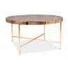 Okrągły stolik kawowy z blatem wykonanym ze szkła hartowanego oraz solidnym metalowym stelażem w urokliwym złotym kolorze to połączenie elegancji i trwałości.