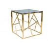 Elegancka mała ława w stylu glamour, wykonana z najwyższej jakości materiałów. To mebel, który przyciąga uwagę dzięki swojemu wyjątkowemu stelażowi, wykonanemu z metalu o złotym połysku, oraz szklanemu blatu.