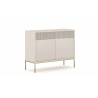 Fronty szuflad i drzwi zostały wykonane z ryflowanego MDF-u i laminowanej płyty, co nadaje całości nowoczesnego charakteru. Komoda oferuje 2 szuflady na prowadnicach kulkowych oraz 2 zamykane szafki, zapewniając dużo miejsca na przechowywanie.