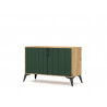 Ta elegancka i praktyczna komoda salonowa to doskonały wybór dla osób ceniących sobie połączenie nowoczesności z naturalnymi akcentami. Stworzona z myślą o współczesnych wnętrzach, komoda ta wyróżnia się ryflowanymi frontami drzwi w soczystym odcieniu zieleni, które są nie tylko atrakcyjnym elementem dekoracyjnym, ale także zapewniają łatwość w użytkowaniu dzięki solidnym uchwytom. Korpus mebla wykonany z płyty wiórowej melaminowanej imitującej naturalne drewno, nadaje wnętrzu ciepły i przytulny charakter.