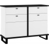 Minimalistyczna dwudrzwiowa komoda, osadzona na smukłym metalowym stelażu, oferująca dużo miejsca do przechowywania dzięki pojemnym szafkom oraz szufladom.