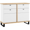 Minimalistyczna dwudrzwiowa komoda, osadzona na smukłym metalowym stelażu, oferująca dużo miejsca do przechowywania dzięki pojemnym szafkom oraz szufladom.