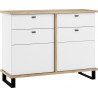 Minimalistyczna dwudrzwiowa komoda, osadzona na smukłym metalowym stelażu, oferująca dużo miejsca do przechowywania dzięki pojemnym szafkom oraz szufladom.