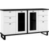 Minimalistyczna komoda z metalowym stelażem, wyposażona w pojemne szuflady i szafki, zapewniające dodatkową przestrzeń na przechowywanie przedmiotów codziennego użytku w eleganckim stylu.
