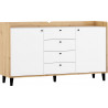 Minimalistyczna komoda z szufladami oraz szafkami, w stylu vintage na drewnianych nóżkach.