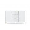 Stylowa i funkcjonalna komoda Flinn do salonu to idealne rozwiązanie dla osób ceniących nowoczesny design oraz praktyczność. Nasza komoda wyróżnia się eleganckim, białym wykończeniem, które doskonale komponuje się z każdą aranżacją wnętrza, dodając mu świeżości i lekkości. Złote detale, takie jak nóżki i uchwyty, wprowadzają nutę luksusu, sprawiając, że mebel staje się nie tylko praktycznym, ale także dekoracyjnym elementem przestrzeni. Dzięki przestronnej szafce oraz trzem szufladom, komoda zapewnia mnóstwo miejsca na przechowywanie różnych przedmiotów, od książek po drobiazgi. Frezowane fronty dodają charakteru, jednocześnie ułatwiając wentylację wnętrza. Idealna do salonu, jadalni czy przedpokoju, nasza komoda łączy w sobie estetykę i funkcjonalność, stając się doskonałym wyborem dla każdego nowoczesnego wnętrza. Wprowadź harmonię i porządek do swojego domu z naszą elegancką komodą!