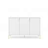 Wprowadź elegancję i nowoczesność do swojego salonu dzięki naszej komodzie Flinn, która łączy w sobie funkcjonalność i wyrafinowany design. Wykonana z wysokiej jakości materiałów, komoda charakteryzuje się stylowym białym wykończeniem oraz złotymi detalami, które dodają jej wyjątkowego charakteru. Frezowane fronty drzwiczek nie tylko nadają lekkości, ale także zapewniają efektowną prezentację przechowywanych przedmiotów. Komoda oferuje przestronny układ, z licznymi półkami, co umożliwia łatwe i estetyczne przechowywanie różnych akcesoriów, od książek po dekoracje. Stabilna konstrukcja oraz nowoczesne nóżki sprawiają, że jest to nie tylko atrakcyjny, ale i trwały mebel. Idealnie wpisuje się w każdą aranżację, dodając uroku i ciepła Twojemu wnętrzu. Wybierz naszą komodę, aby stworzyć wyjątkową atmosferę w swoim salonie, zachwycając gości i ciesząc się pięknem codzienności.