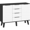 Ta minimalistyczna komoda na drewnianych nóżkach, wyposażona jest w cztery szuflady oraz dwie szafki, posiadające delikatne wypukłe listwy, które zapewniają wygodne otwieranie. Jej skandynawska estetyka doda niepowtarzalnego charakteru Twojemu pomieszczeniu.