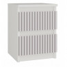 Nowoczesny stolik nocny w białym kolorze, wykonany z wysokiej jakości płyty meblowej, to idealne rozwiązanie do każdej sypialni. Wyposażony w dwie pojemne szuflady z unikalnymi frontami o pionowym żebrowaniu, łączy w sobie funkcjonalność i stylowy design. Dzięki kompaktowym wymiarom, świetnie sprawdzi się nawet w niewielkich pomieszczeniach, oferując praktyczną przestrzeń do przechowywania niezbędnych przedmiotów przy łóżku. Jego minimalistyczny wygląd i eleganckie wykończenie doskonale uzupełnią nowoczesne wnętrza, dodając im lekkości i elegancji.