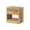 Prosta szafka nocna z jedną szufladą i otwartą półką, wykonana z trwałych materiałów, idealna do przechowywania i organizacji niezbędnych przedmiotów przy łóżku.