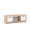 Prosta szafka RTV z dwoma pojemnymi szafkami oraz otwartą półką.