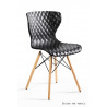 Stylowe krzesło o nowoczesnym designie, osadzone na smukłych drewnianych nóżkach i zdobione ciekawym wzorem na siedzisku i oparciu.