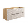 Stylowa szafka łazienkowa pod umywalkę, która łączy w sobie nowoczesny design z wyjątkową funkcjonalnością. Korpus szafki został zrobiony z trwałej płyty laminowanej, imitującej naturalny deseń drewna, co dodaje wnętrzu łazienki ciepła i przytulności. Front wykonany z płyty MDF charakteryzuje się eleganckim beżowym wykończeniem z nowoczesnym wzorem, co dodaje szafce charakteru i stanowi modny element dekoracyjny. Ta praktyczna szafka oferuje wystarczającą ilość miejsca do przechowywania łazienkowych niezbędników, utrzymując porządek i organizację przestrzeni. Wytrzymałość materiałów zapewnia długotrwałe użytkowanie, a łatwość w czyszczeniu gwarantuje utrzymanie estetycznego wyglądu. Idealna dla osób ceniących sobie połączenie estetyki z praktycznymi rozwiązaniami w aranżacji łazienkowej.