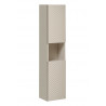Wysoka szafka łazienkowa w eleganckim, nowoczesnym stylu, idealna do przestronnych łazienek. Wykonana z wysokiej jakości materiałów, jej fronty zdobi subtelny wzór w jodełkę, który dodaje wnętrzu wyrafinowanego charakteru. Dwa pojemne schowki z drzwiczkami oferują przestronność do przechowywania kosmetyków i innych akcesoriów łazienkowych, a otwarta półka pośrodku stanowi dodatkową przestrzeń na eksponowanie dekoracji lub podręcznych przedmiotów. Szafka ma minimalistyczny design w stonowanej, kaszmirowej kolorystyce, która pasuje do wielu aranżacji, nadając łazience wyjątkowy, stylowy wygląd.