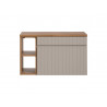 Fronty mebli zostały ozdobione frezowanymi ryflami pionowymi, dodając im subtelny akcent. Uchwyty w kolorze kaszmiru doskonale komponują się z resztą zestawu. Składowe zestawu to: szafka pod umywalkę ICONIC CASHMERE 82-60-D-1S, blat BLAT 89-80-A OAK COAST EVOKE oraz szafka pod blat ICONIC OAK COAST EVOKE 81-01-A. Każdy element został starannie zaprojektowany, aby zapewnić zarówno funkcjonalność, jak i estetykę.