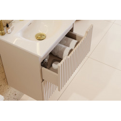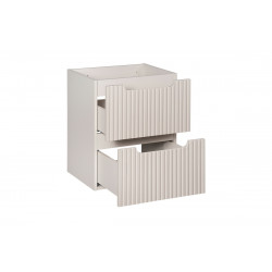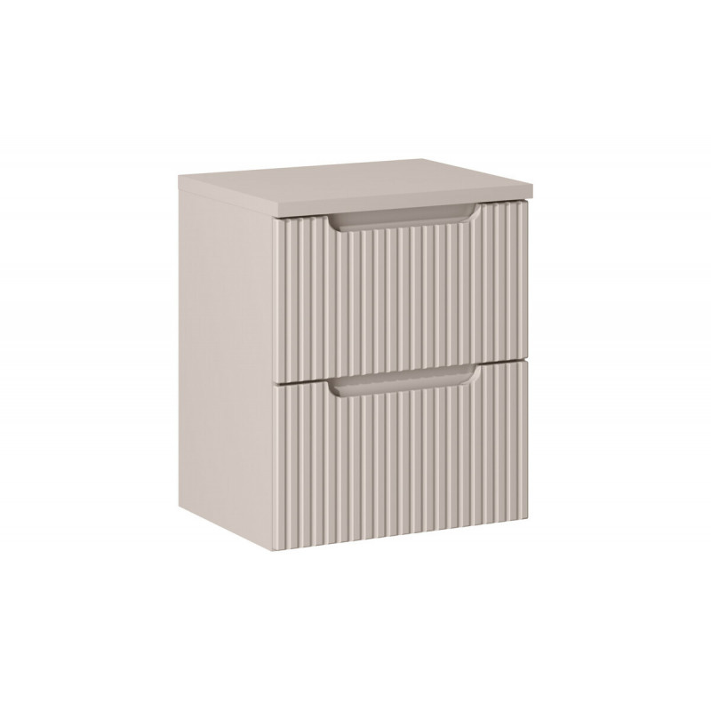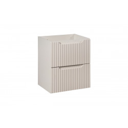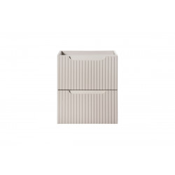 Elegancka szafka wisząca do łazienki w nowoczesnym stylu, idealna do przechowywania kosmetyków i innych akcesoriów. Wykonana z trwałych materiałów, z subtelnym, ryflowanym wzorem na frontach, który nadaje jej unikalny charakter. Mebel wyróżnia się minimalistycznym wyglądem i funkcjonalnością, oferując przestronne szuflady z łatwym dostępem do wnętrza. Szafka doskonale wpisuje się w nowoczesne łazienki, gdzie wisząca konstrukcja pomaga zaoszczędzić miejsce, jednocześnie podkreślając elegancki wystrój wnętrza.