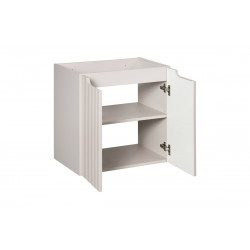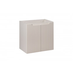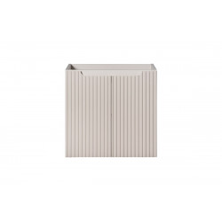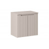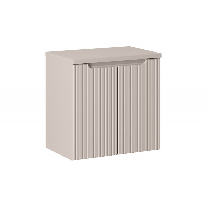 Szafka wisząca do łazienki z eleganckim, pionowym żłobieniem na frontach, co nadaje jej nowoczesny i minimalistyczny wygląd. Wykonana z trwałych materiałów, które zapewniają odporność na wilgoć. Blat w kolorze kaszmirowym, odporny na zabrudzenia i łatwy do utrzymania w czystości. Mebel oferuje funkcjonalną przestrzeń do przechowywania, idealny do mniejszych łazienek, gdzie liczy się zarówno estetyka, jak i praktyczność. Dzięki swojej prostej formie i neutralnym kolorom, szafka świetnie komponuje się z innymi elementami nowoczesnych aranżacji łazienkowych.
