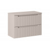 Zestaw mebli wiszących do łazienki, który łączy funkcjonalność z nowoczesnym stylem. Szafka posiada dwa przestronne schowki, które umożliwiają przechowywanie kosmetyków, ręczników i innych akcesoriów łazienkowych. Fronty z charakterystycznym rowkowanym wzorem nadają jej unikalny wygląd, a górny blat, wykonany z gładkiego materiału, zapewnia łatwość w utrzymaniu czystości. Mebel idealnie pasuje do nowoczesnych łazienek, oferując praktyczne rozwiązania w minimalistycznej formie.