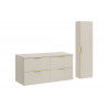 Zestaw mebli łazienkowych w eleganckim i nowoczesnym stylu, doskonały do stworzenia funkcjonalnej i estetycznej przestrzeni w łazience. Zestaw składa się z szafki pod umywalkę oraz wąskiego słupka. Szafka wyposażona w cztery przestronne szuflady, które oferują dużą pojemność do przechowywania kosmetyków, ręczników i innych akcesoriów. Fronty szuflad ozdobione są delikatnym rowkowanym wzorem, co nadaje meblom subtelny, ale nowoczesny charakter. Uchwyt w kolorze złota nadaje całości luksusowego wykończenia, wyróżniając się na tle jasnej kolorystyki mebli. Blat szafki jest prosty i elegancki, w neutralnym odcieniu, który pasuje do większości stylów łazienkowych. Dodatkowo, w zestawie znajduje się słupek, który ułatwia przechowywanie węższych przedmiotów. Zestaw łączy funkcjonalność z estetyką, idealnie komponując się w nowoczesnych łazienkach, wprowadzając do wnętrza harmonię i porządek.