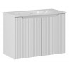 Zestaw wiszący do łazienki z przestronnymi drzwiami i umywalką, idealny do nowoczesnych wnętrz. Fronty z wyraźnym, ryflowanym wzorem dodają meblowi elegancji, a minimalistyczny wygląd z białym wykończeniem sprawia, że zestaw doskonale wpasowuje się w różne style aranżacji. Górna część zawiera przestronną umywalkę, która zapewnia wygodę użytkowania, a drzwi pozwalają na przechowywanie niezbędnych akcesoriów łazienkowych w sposób estetyczny i uporządkowany. Idealny wybór do łazienek, które łączą funkcjonalność z nowoczesnym designem.