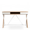 Konstrukcja biurka jest nie tylko estetycznie przyjemna, ale także funkcjonalna. Oferuje ono przestronną szufladę, która doskonale nadaje się do przechowywania wszystkich niezbędnych akcesoriów biurowych, od dokumentów po przybory do pisania, pomagając utrzymać porządek na roboczym blacie. Stabilna i wytrzymała rama zapewnia doskonałą podstawę, a unikalny kształt nóg dodaje charakterystycznego, nowoczesnego uroku.