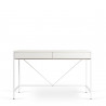 Przedstawiamy nowoczesne biurko w bieli, które doskonale sprawdzi się w każdym nowoczesnym biurze lub domowym gabinecie. Biurko to wyróżnia się minimalistycznym designem z białą, gładką powierzchnią i metalową konstrukcją nóg, co dodaje mu elegancji i współczesnego charakteru. Wyposażone w dwie przestronne szuflady, biurko zapewnia dużo miejsca na przechowywanie dokumentów, artykułów biurowych oraz innych potrzebnych akcesoriów, co pozwala utrzymać porządek i organizację na stanowisku pracy. Jego prosta, ale funkcjonalna forma oferuje wystarczającą przestrzeń roboczą, co czyni go idealnym wyborem dla tych, którzy cenią sobie przemyślane rozwiązania w eleganckim stylu.