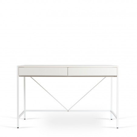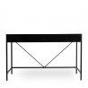 Oto nowoczesne biurko, idealne dla każdego nowoczesnego biura lub domowego gabinetu, które łączy w sobie funkcjonalność i styl. To biurko jest wykonane z wysokiej jakości płyty meblowej w głębokim, czarnym wykończeniu, co nadaje mu elegancki i profesjonalny wygląd. Jego solidna konstrukcja opiera się na metalowych nogach w kształcie litery X, które nie tylko zapewniają stabilność, ale także dodają nowoczesnego charakteru oraz wizualnej lekkości.