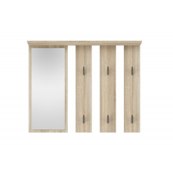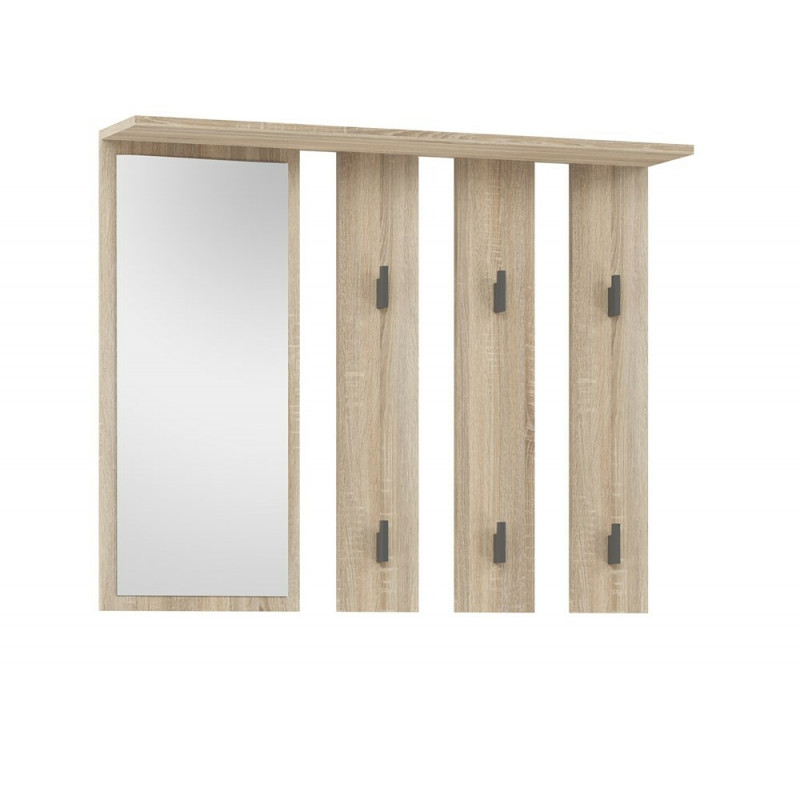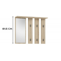 Wieszak na ubrania do przedpokoju z sześcioma haczykami to funkcjonalne i estetyczne rozwiązanie, idealne do każdego wnętrza. Wykonany z wysokiej jakości płyty laminowanej w kolorze dębu sonoma, wieszak charakteryzuje się naturalnym wyglądem, który wprowadza ciepło i przytulność do przedpokoju. Sześć solidnych, grafitowych haczyków zapewnia wystarczającą ilość miejsca na zawieszenie płaszczy, kurtek, toreb czy parasoli, pomagając w utrzymaniu porządku. Dodatkową zaletą jest duże lustro, które umożliwia szybkie sprawdzenie wyglądu przed wyjściem z domu, jednocześnie optycznie powiększając przestrzeń. Wieszak ten doskonale komponuje się z nowoczesnymi oraz klasycznymi aranżacjami, stanowiąc praktyczny i stylowy element wyposażenia każdego przedpokoju.