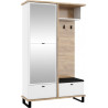 Ten przedpokój to propozycja dla osób, które dysponują niewielką przestrzenią bądź lubią minimalizm. W bryle mieści się wszystko, co niezbędne, a więc półki na ubrania, buty i pudełka z akcesoriami, wieszaki na kurtki oraz lustro. To ostatnie nie zabiera dodatkowego miejsca, bo zamontowano je na froncie szafki. Pozwoli obejrzeć całą sylwetkę i optycznie powiększy przedpokój. Praktycznym dodatkiem jest też siedzisko z ekoskóry, które sprawi, że zakładanie i zdejmowanie obuwia będzie łatwiejsze. Mebel jest dostępny w kilku uniwersalnych wariantach kolorystycznych. W oczy rzucają się dodatki – haczyki, klamki i modernistyczne nóżki – tworzą ciekawe wykończenie. Wysokość mebla ułatwia sprzątanie pod nim, a użyte materiały gwarantują jakość i długą żywotność.