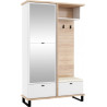 Ten przedpokój to propozycja dla osób, które dysponują niewielką przestrzenią bądź lubią minimalizm. W bryle mieści się wszystko, co niezbędne, a więc półki na ubrania, buty i pudełka z akcesoriami, wieszaki na kurtki oraz lustro. To ostatnie nie zabiera dodatkowego miejsca, bo zamontowano je na froncie szafki. Pozwoli obejrzeć całą sylwetkę i optycznie powiększy przedpokój. Praktycznym dodatkiem jest też siedzisko z ekoskóry, które sprawi, że zakładanie i zdejmowanie obuwia będzie łatwiejsze. Mebel jest dostępny w kilku uniwersalnych wariantach kolorystycznych. W oczy rzucają się dodatki – haczyki, klamki i modernistyczne nóżki – tworzą ciekawe wykończenie. Wysokość mebla ułatwia sprzątanie pod nim, a użyte materiały gwarantują jakość i długą żywotność.