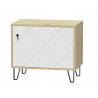 Szafka posiada jedne drzwi z praktycznym, czarnym uchwytem, które otwierają się, by ujawnić obszerną przestrzeń do przechowywania. Jest to idealne miejsce na buty, akcesoria czy inne przedmioty niezbędne w codziennym życiu. Ponadto, smukłe, metalowe nóżki nie tylko dodają szafce lekkości i współczesnego charakteru, ale również ułatwiają utrzymanie porządku i czystości podłogi.
