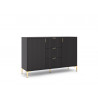 Poznaj nowoczesną komodę do salonu, która łączy elegancję z funkcjonalnością. Ta czarna komoda z matowym wykończeniem i pionowymi, geometrycznymi drzwiami dodaje wnętrzu nowoczesności i wyrafinowanego stylu. Złote detale, takie jak nóżki i uchwyty, podkreślają jej luksusowy charakter, tworząc harmonijną całość. Komoda oferuje przestronne wnętrze z trzema szufladami i dwoma szafkami, idealne do przechowywania różnych przedmiotów, co pomaga utrzymać porządek w salonie. Dzięki solidnej konstrukcji i wysokiej jakości materiałom, komoda gwarantuje trwałość i długotrwałe użytkowanie. Wybierz tę komodę, aby dodać swojemu salonowi nowoczesny i stylowy akcent, który przyciągnie wzrok i stworzy harmonijną atmosferę. To doskonałe rozwiązanie dla osób ceniących sobie połączenie estetyki i praktyczności w jednym meblu, który podkreśli wyjątkowy charakter każdego wnętrza.