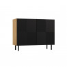 Elegancka komoda do salonu w nowoczesnym stylu to idealny wybór dla osób ceniących oryginalne i stylowe rozwiązania w aranżacji wnętrz. Jej unikatowy design łączy naturalne o z wyrazistymi czarnymi frontami, które zdobi subtelny, geometryczny wzór. Komoda nie tylko przyciąga wzrok, ale również oferuje praktyczne rozwiązania do przechowywania – pojemne szafki pomieszczą wszystkie niezbędne akcesoria, dokumenty czy dekoracje. Mebel ten doskonale sprawdzi się w nowoczesnych oraz minimalistycznych wnętrzach, dodając im charakteru i wyrafinowania.