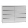 Nowoczesna biała komoda do sypialni to idealne rozwiązanie dla osób ceniących elegancję i funkcjonalność. Komoda wyposażona jest w osiem przestronnych szuflad, które oferują mnóstwo miejsca na przechowywanie ubrań, bielizny oraz innych akcesoriów, pomagając w utrzymaniu porządku w sypialni. Jej minimalistyczny design z gładkimi frontami bez uchwytów podkreśla nowoczesny, elegancki charakter mebla. Śnieżnobiała kolorystyka wprowadza do wnętrza lekkość i świeżość, optycznie powiększając przestrzeń. Wykonana z wysokiej jakości materiałów, komoda gwarantuje trwałość i solidność, będąc jednocześnie stylowym i praktycznym elementem wyposażenia każdej sypialni. To doskonały wybór dla osób, które szukają funkcjonalnego, nowoczesnego mebla, który doda wnętrzu elegancji i harmonii.