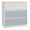 Nowoczesna komoda z trzema szufladami to stylowy i praktyczny mebel, który doskonale sprawdzi się w sypialni lub pokoju dziennym. Jej wyjątkowy design łączy minimalistyczną formę z ciekawym akcentem dekoracyjnym w postaci żłobionych frontów w kolorze niebieskim, co nadaje wnętrzu oryginalnego charakteru. Komoda zapewnia dużo przestrzeni do przechowywania dzięki trzem pojemnym szufladom, idealnym na ubrania, pościel czy inne drobiazgi. Biały kolor korpusu harmonijnie współgra z każdym stylem aranżacji, dodając wnętrzu świeżości i lekkości. To doskonały wybór dla osób ceniących funkcjonalność połączoną z eleganckim wyglądem.