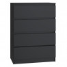 Wprowadź nowoczesny styl i elegancję do swojej sypialni z naszą komodą w głębokim, czarnym wykończeniu, która łączy minimalistyczny design z praktycznością. Ta stylowa komoda oferuje cztery przestronne szuflady, doskonałe do przechowywania ubrań, bielizny oraz innych drobiazgów, co pozwala na łatwe utrzymanie porządku w pomieszczeniu. Solidna konstrukcja zapewnia trwałość, a szuflady z nowoczesnym systemem prowadnic działają płynnie i cicho, zwiększając komfort codziennego użytkowania. Uniwersalny czarny kolor sprawia, że komoda idealnie wpasuje się w różnorodne aranżacje wnętrz, dodając im wyrazistego charakteru. To doskonały wybór dla osób ceniących elegancję i funkcjonalność w meblach.