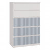Biała komoda do sypialni o nowoczesnym designie to idealne rozwiązanie dla osób ceniących funkcjonalność i estetykę. Ta komoda wyposażona jest w pięć pojemnych szuflad, z których trzy dolne wyróżniają się unikalnym, żebrowanym frontem w niebieskim odcieniu, dodającym meblowi oryginalności. Górne szuflady są gładkie, co podkreśla minimalistyczny charakter całości. Komoda wykonana jest z wysokiej jakości materiałów, co gwarantuje jej trwałość i solidność. Świetnie sprawdzi się w nowoczesnych wnętrzach, oferując przestrzeń do przechowywania ubrań i innych rzeczy, jednocześnie stanowiąc stylowy element dekoracyjny w sypialni.