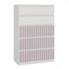 Stylowa komoda do sypialni w kolorze białym to idealny wybór dla osób poszukujących nowoczesnego i funkcjonalnego mebla. Komoda wyposażona jest w pięć przestronnych szuflad, z czego trzy dolne wyróżniają się oryginalnym frontem o żebrowanej strukturze w delikatnym, różowym odcieniu. Gładkie, górne szuflady podkreślają minimalistyczny design, który świetnie komponuje się z nowoczesnymi aranżacjami wnętrz. Komoda wykonana jest z wysokiej jakości materiałów, co zapewnia jej trwałość i solidność. To doskonały mebel do przechowywania ubrań i akcesoriów, który jednocześnie pełni funkcję dekoracyjną, dodając sypialni subtelnej elegancji.