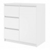 Nowoczesna komoda do sypialni w białym kolorze to idealne rozwiązanie dla osób ceniących minimalistyczny design i funkcjonalność. Wyposażona w trzy pojemne szuflady oraz szafkę, oferuje dużo miejsca na przechowywanie ubrań, pościeli i innych niezbędnych przedmiotów. Jej prosta forma i eleganckie wykończenie sprawiają, że komoda doskonale wpasuje się w każdą aranżację wnętrza, dodając mu świeżości i lekkości. Wysoka jakość wykonania gwarantuje trwałość i długowieczność mebla, czyniąc go niezastąpionym elementem wyposażenia sypialni.