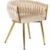 Stylowe krzesło tapicerowane w kremowym kolorze, wykonane z wysokiej jakości weluru, idealnie nadaje się do eleganckiego salonu lub toaletki, dodając wnętrzu nowoczesnego, glamour charakteru. Złote, metalowe nogi krzesła nie tylko zapewniają stabilność i trwałość, ale również podkreślają jego luksusowy wygląd. Ergonomicznie zaprojektowane oparcie, ozdobione efektownymi przeszyciami, zapewnia maksymalny komfort siedzenia, co czyni krzesło nie tylko pięknym, ale również funkcjonalnym elementem wyposażenia wnętrza. Dzięki zastosowaniu najwyższej jakości materiałów, krzesło jest łatwe w pielęgnacji i odporne na codzienne użytkowanie, zachowując swój elegancki wygląd na długie lata.