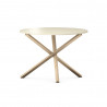 Minimalistyczny okrągły stół z nietypowym stelażem, wykonanym z wysokiej jakości litego drewna sosnowego.