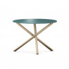Minimalistyczny okrągły stół z nietypowym stelażem, wykonanym z wysokiej jakości litego drewna sosnowego.