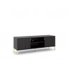 Odkryj nowoczesną szafkę RTV, która łączy elegancję i funkcjonalność, idealną do każdego salonu. Ta czarna szafka RTV z pionowymi, geometrycznymi drzwiami, dodaje wnętrzu nowoczesności i stylu. Złote detale, takie jak nóżki i uchwyty, podkreślają jej luksusowy charakter, tworząc harmonijną całość. Szafka oferuje przestronne półki na sprzęt audio-video oraz dodatkowe miejsca za drzwiami, które zapewniają idealną organizację i porządek. Wykonana z wysokiej jakości materiałów, gwarantuje trwałość i długotrwałe użytkowanie. Wybierz tę szafkę RTV, aby dodać swojemu salonowi nowoczesny i elegancki akcent, który przyciągnie wzrok Twoich gości i podkreśli wyjątkowy charakter wnętrza. To idealne rozwiązanie dla osób ceniących sobie połączenie estetyki i praktyczności w jednym meblu.