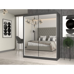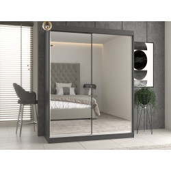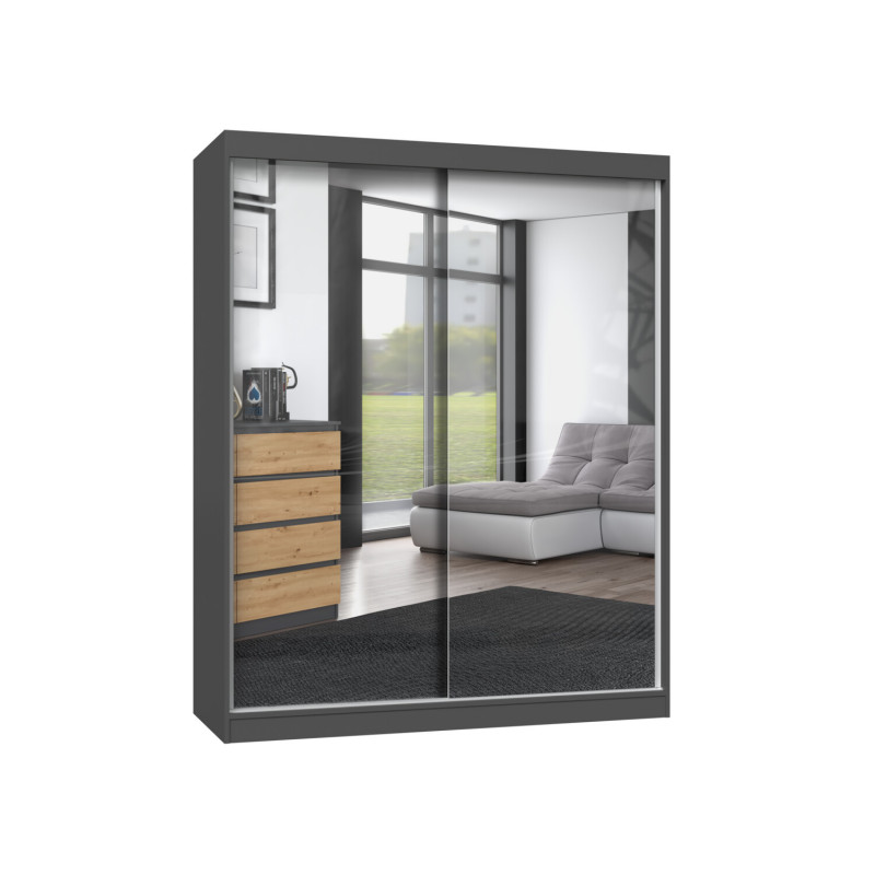 Elegancka szafa przesuwna z lustrzanymi drzwiami to doskonały wybór do sypialni lub pokoju, łączący nowoczesny design z funkcjonalnością. Lustrzane fronty optycznie powiększają przestrzeń, dodając wnętrzu głębi i jasności. Szafa oferuje pojemne wnętrze z licznymi półkami oraz drążkiem na ubrania, umożliwiając utrzymanie porządku w Twojej garderobie. Solidne wykonanie i stonowana kolorystyka sprawiają, że mebel idealnie komponuje się z różnorodnymi stylami wnętrzarskimi, od minimalistycznych po bardziej klasyczne aranżacje.