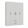 Elegancka szafa do sypialni lub pokoju w klasycznym białym kolorze to idealne rozwiązanie dla osób ceniących funkcjonalność i styl. Dzięki czterem drzwiom oferuje dużo miejsca do przechowywania odzieży i innych rzeczy osobistych. Wnętrze szafy jest wyposażone w liczne półki, drążek na wieszaki oraz dwie pojemne szuflady, co umożliwia wygodne i uporządkowane przechowywanie. Wysokiej jakości materiały oraz solidne wykonanie gwarantują trwałość i długowieczność mebla, a minimalistyczny design sprawia, że szafa doskonale wpasuje się w każdy wystrój wnętrza.