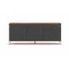 Komoda wyposażona jest w trzy przestronne szuflady i dwie szafki, oferując obfitość miejsca do przechowywania i pomagając utrzymać porządek w salonie. Czarne, delikatne uchwyty nie tylko ułatwiają dostęp, ale także są eleganckim akcentem, który doskonale współgra z minimalistycznym stylem mebla.